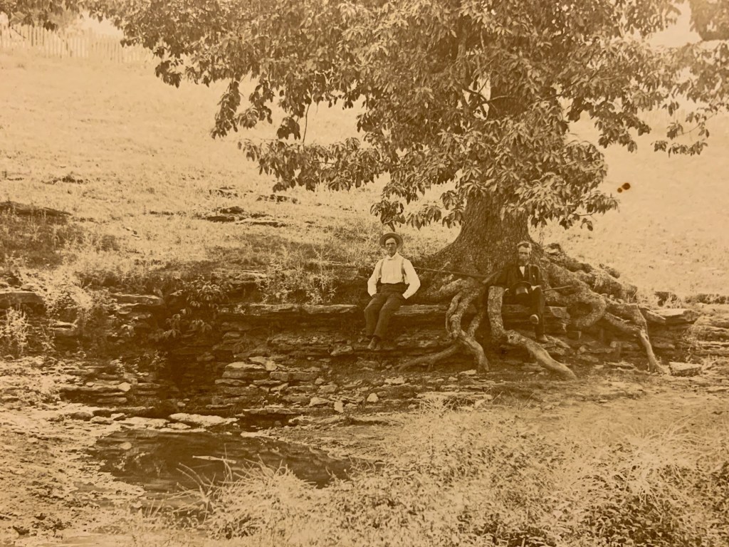 I love this photo. It was taken at the head or spring of Jessamine Creek that I knew somewhat as a child and my father knew as part of his daily life at the old home place. An original of this image is among the family heirloom artifacts I am in the process of documenting, which leads me to wonder if these men are ancestors of mine. The slope of the hillside, stacked layers of limestone formation, trickling water you can almost hear, the majestic shade tree with exposed mature roots like tentacles and brush in the foreground. I easily wax romantic about the richness of the scene. Additionally, this image appears in History of Jessamine County, Kentucky reference found in the Jessamine County Public Library. There are many great resources there.