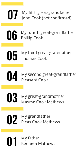 With confidence in research validations, I know Pleasant Cook and Mary Chowning to be my great-great grandparents. From Pleasant, I am working my way further along his tree including his father named Thomas Cook, mother Nancy Easley (surname also found in my maternal grandmother’s tree) and possibly three siblings or more. From the family artifacts collection, there is a handwritten listing of Chowning family and their respective birth, death and marriage dates which will come in handy when I get to that stage of research. The Chownings, along with the Singletons, were early settlers of the area and presumably purchased from surveyor and settler James Douglass. *Research topic for later