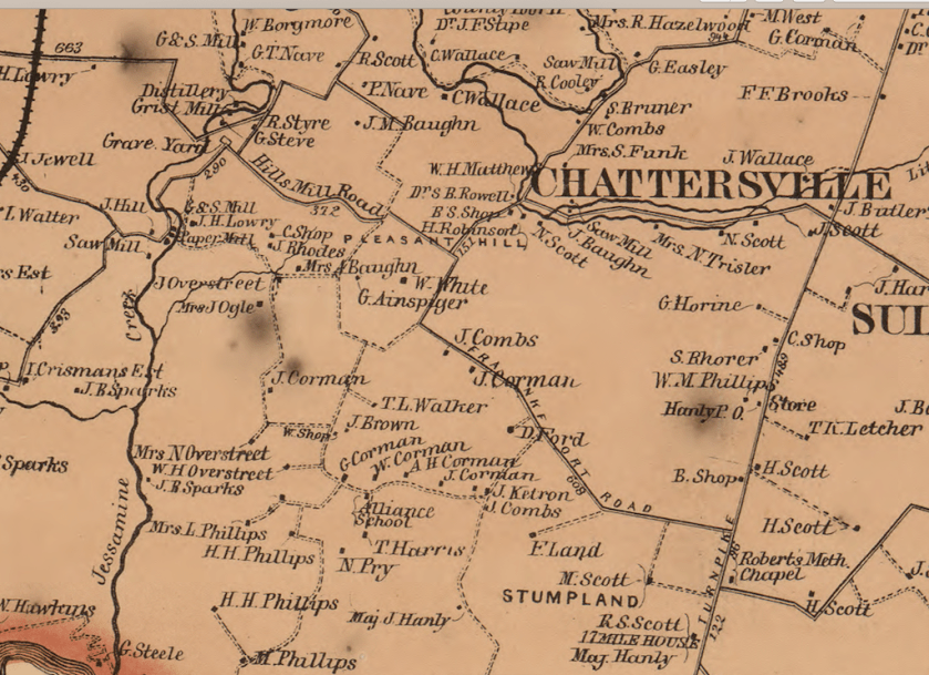 Dr. W. H. Mathews II was born, was raised and later settled his family and his medical practice all in the proximity of the location noted on map as “W. H. Mat(t)hews” (see “C” in Chattersville)