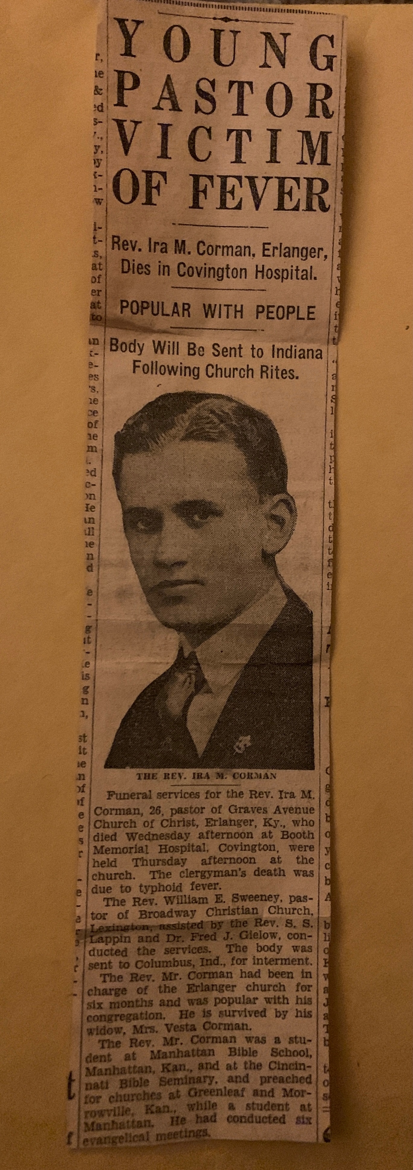 She was a native of Lexington. Mrs. Corman lived at 6 Floral Avenue in South Fort Mitchell and was a member of the Madison Avenue Christian Church there.