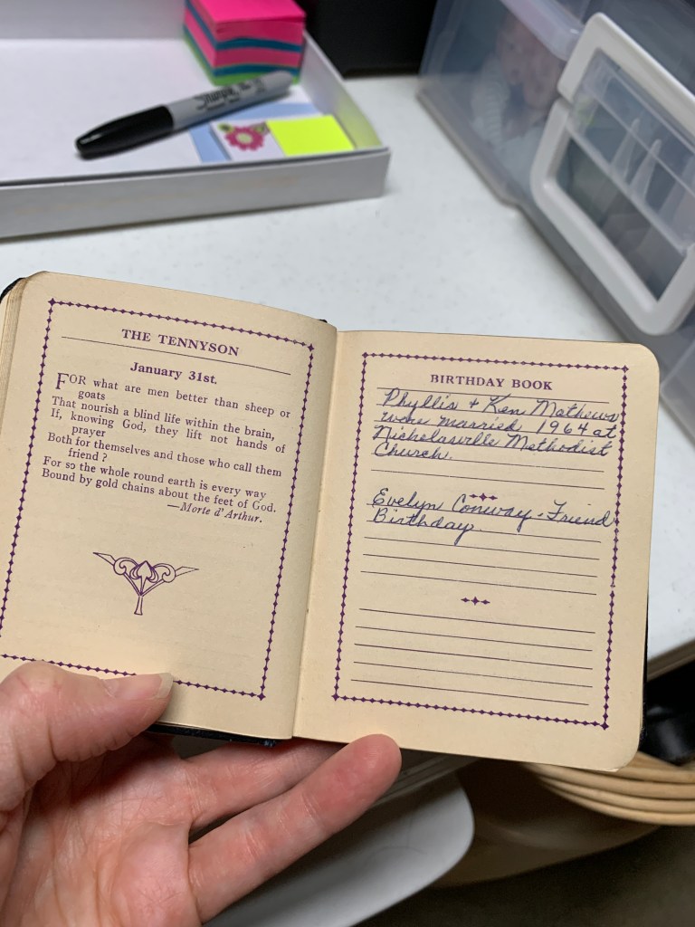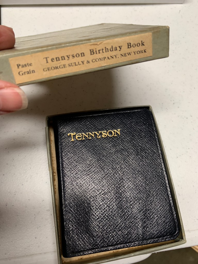 She gave me her first birthday book. A pocket-sized “Tennyson Birthday Book” made in England and sprinkled with quotes throughout the daily, lined sections for recording details. She received it from her maternal Aunt Pearl upon graduating high school in 1930. I believe this was the foundation of Cutters’ lifelong practice of recording and commemorating important family dates.
