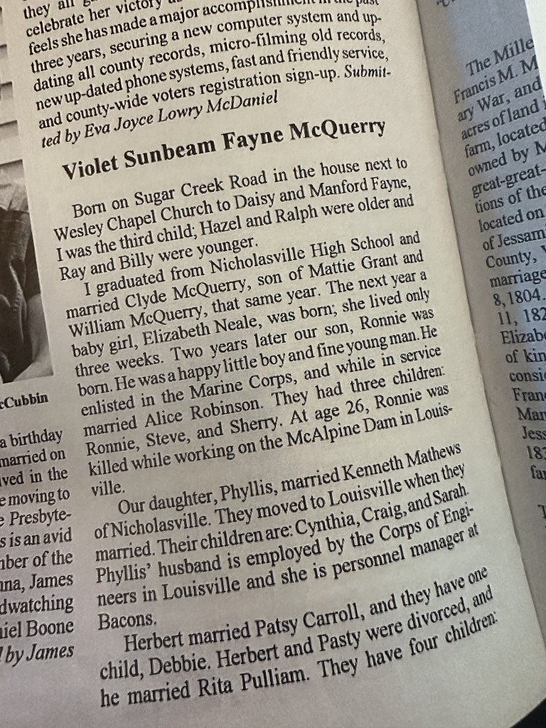 A resource* housed in the Jessamine County Public Library on Main Street, Nicholasville, KY, was published as a commemorative Jessamine County history and included individual citizens’ written accounts. My grandmother, Cutters, contributed her own biography which was included in this publication.