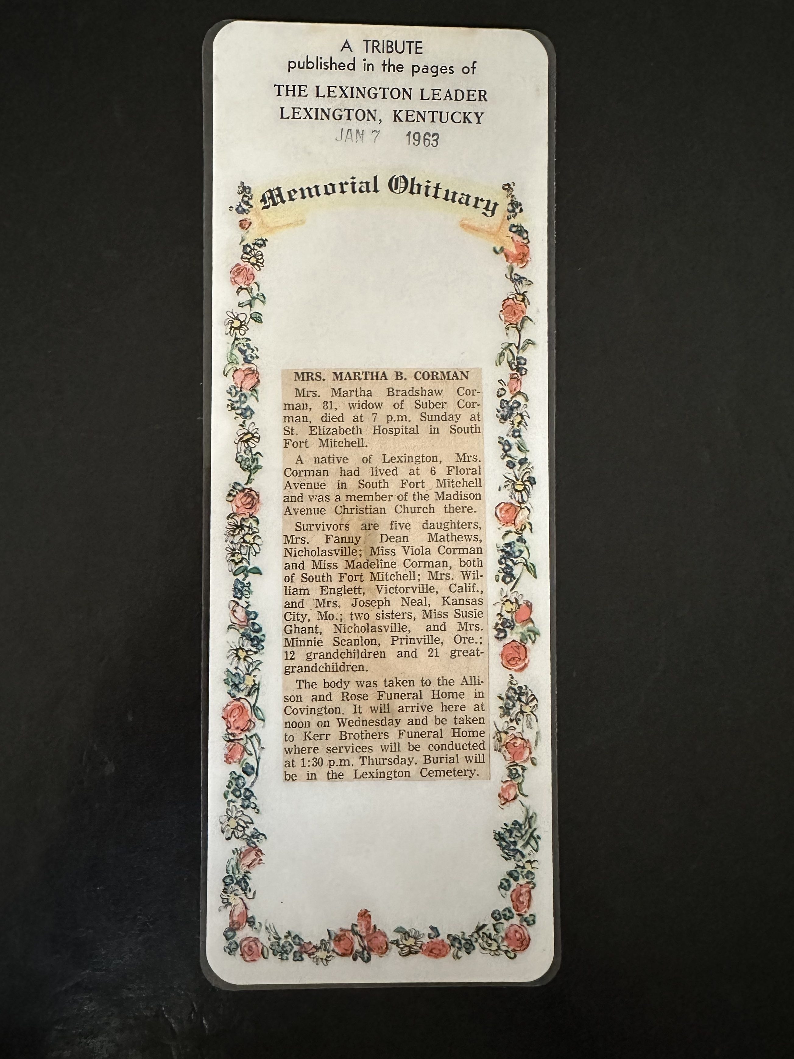 She was a native of Lexington. Mrs. Corman lived at 6 Floral Avenue in South Fort Mitchell and was a member of the Madison Avenue Christian Church there.