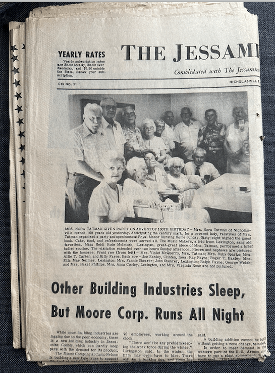 MRS. NORA TATMAN GIVEN PARTY ON ADVENT OF 100TH BIRTHDAY – Mrs. Nora Tatman of Nicholasville turned 100 years old yesterday. Anticipating the century mark, for a revered lady, relatives of Mrs. Tatman organized a party and open house at Royal Manor Nursing Home Sunday. Sixty-eight signed the guest book. Cake, food and refreshments were served all. The Music Makers, a trio from Lexington, sang old favorites. Miss Heidi Rode McIntosh, Lexington, great-great niece of Mrs. Tatman, performed a brief ballet routine. the visitation extended over two hours Sunday afternoon. Nieces and nephews are picture with the honoree. Front row (from left) — Mrs. Violet McQuerry, Mrs. Tatman, Mrs. Ruby Sparks, Mrs. Allie T. Carter, and Billy Fayne. Back row — Joe Easley, Clinton, Iowa; Ray Fayne; Roger T. Easley; Mrs. Ella Mae Neimes, Lexington; Mrs. Fannie Shearer; John Shearer, Lexington; Ralph Fayne; George Ewlsh and Mrs. Hazel Phillips. Mrs. Anna Cooley, Lexington, and Mrs. Virginia Rose are not pictured.