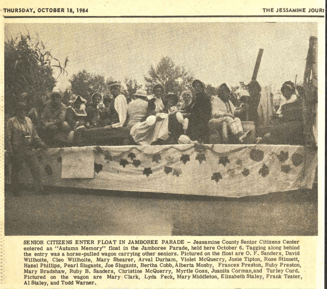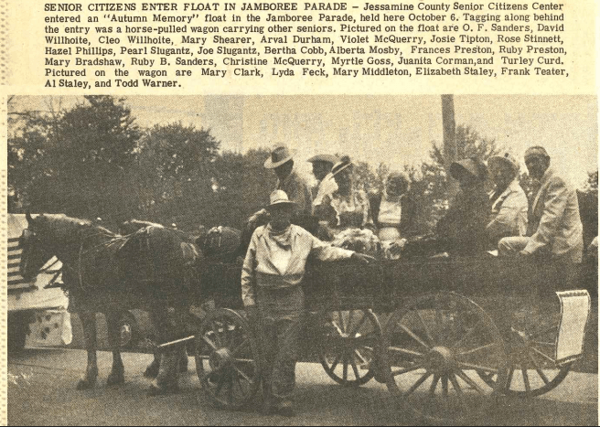 SENIOR CITIZENS ENTER FLOAT IN JAMBOREE PARADE – Jessamine County Senior Citizens Center entered an “Autumn Memory” float in the Jamboree Parade, held here October 6. Tagging along behind the entry was a horse-pulled wagon carrying other seniors. Pictured on the float are O. F. Sanders, David Willhoite, Cleo Willhoite, Mary Shearer, Arval Durham, Violet McQuerry, Josie Tipton, Rose Stinnett, Hazel Phillips, Pearl Slugantz, Joe Slugantz, Bertha Cobb, Alberta Mosby, Frances Preston, Ruby Preston, Mary Bradshaw, Ruby B. Sanders, Christine McQuerry, Myrtle Goss, Juanita Corman, and Turley Curd. Pictured on the wagon are Mary Clark, Lyda Feck, Mary Middleton, Elizabeth Staley, Frank Teater, Al Staley, and Todd Warner.